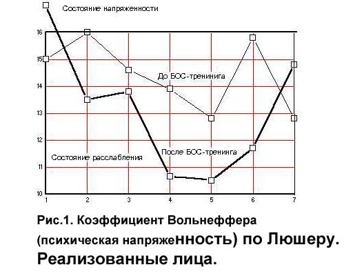 Во второй серии экспериментов две группы пациентов (реализованные и нереализованные) прошли БОС-тренинг по температуре и миограмме. Реализованные лица в процессе БОС-тренинга использовали медитацию по методу Сахаджа Йоги. В целом результаты у реализованных лиц были значительно более эффективнее, чем у нереализованных. Обе группы пациентов прошли психологическое тестирование с использованием анкетных и проективных методов. Тестирование по многофакторному личностному опроснику (ММР1) выявило, что усредненный профиль нереализованных пациентов характеризовался повышенным уровнем тревоги и значительным повышением по шкалам импульсивности и ипохондрии. Усредненный профиль реализованных лиц соответствовал профилю хорошо сбалансированной личности. Проведение теста Люшера позволило увидеть, что коэффициент напряженности Вольнеффера у реализованных пациентов перед проведением БОС- тренинга был значительно ниже, чем у нереализованных. В результате семи сеансов реализованные лица достигли гораздо большей степени снижения этого показателя (см. рис.1 и рис.2).